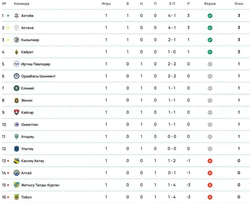 После первого тура КПЛ-2026 верх турнирной таблицы делят Актобе и Астана, а Кызылжар и Кайрат замыкают топ-4.